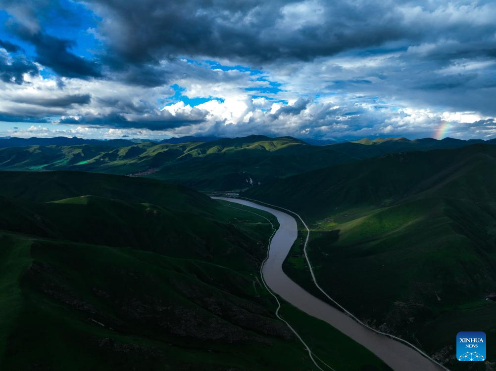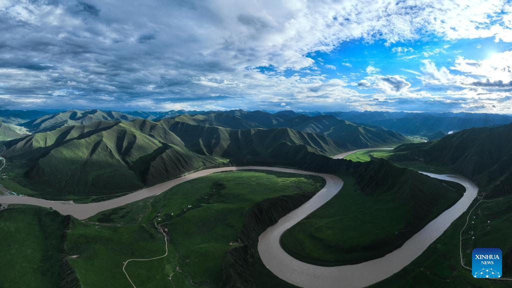An aerial drone photo taken on July 19, 2024 shows the scenery at a bend along the Yellow River in Mentang Township of Jiuzhi County, Golog Tibetan Autonomous Prefecture, northwest China's Qinghai Province. (Xinhua/Zhang Long)