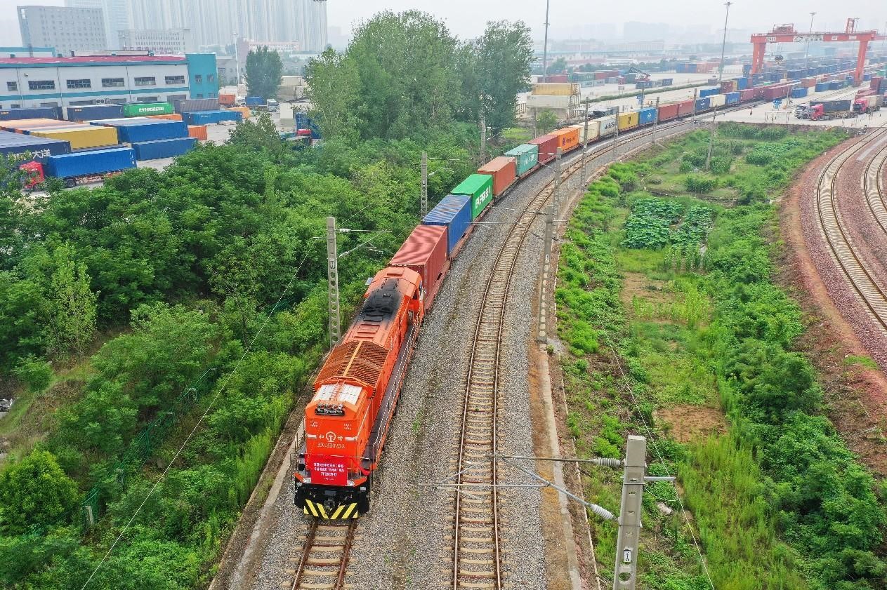 A China-Europe freight train bound for Istanbul, Türkiye, departs from Putian Station in Zhengzhou, capital of central China's Henan province, July 10, 2024. (People's Daily Online/Wang Wei)