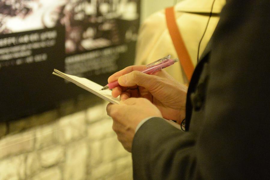A member of a Japanese medical delegation takes notes as he visits a Unit 731 museum in Harbin, capital of northeast China's Heilongjiang Province, May 4, 2014. (Xinhua/Wang Kai)