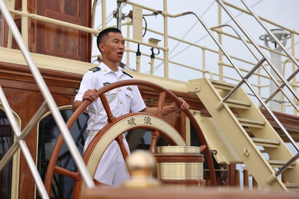 A steersman of the Chinese People's Liberation Army (PLA) Navy demonstrates steering for military attachés aboard a training vessel, July 22, 2024. (Photo by Li Haotian/Xinhua)