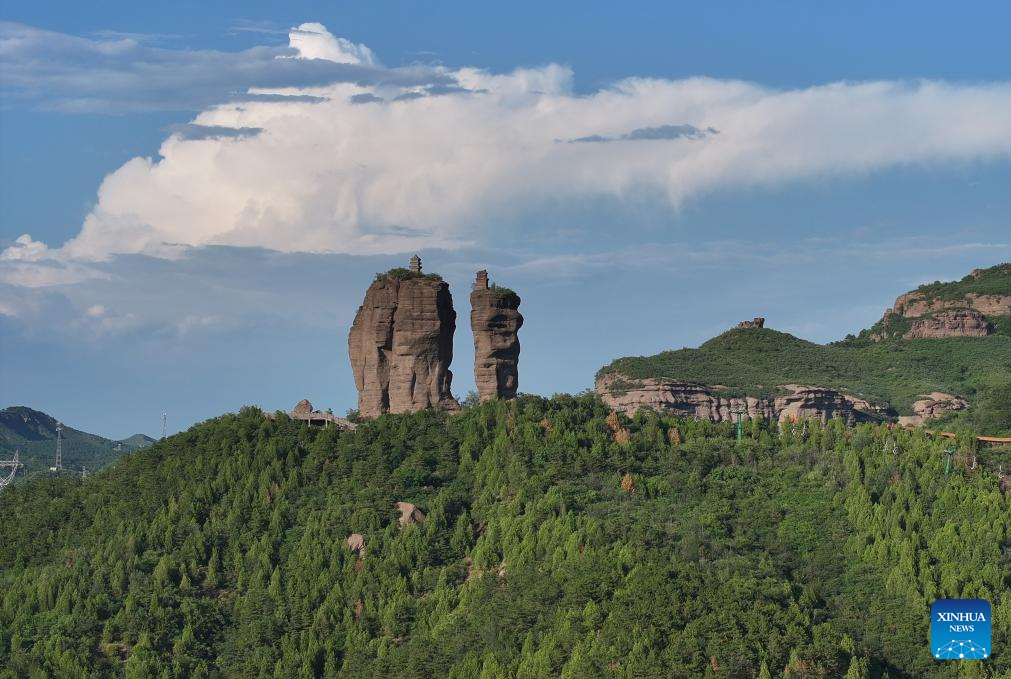 An aerial drone photo taken on July 20, 2024 shows a view of the Shuangta Mountain in Chengde City, north China's Hebei Province. Chengde, a popular summer tourism destination approximately 230 km north of the Chinese capital Beijing, is an important transportation hub in north China. The city with profound cultural heritage is a place where nomadic culture, farming culture, royal culture and folk culture blend together. (Photo by Liu Mancang/Xinhua)