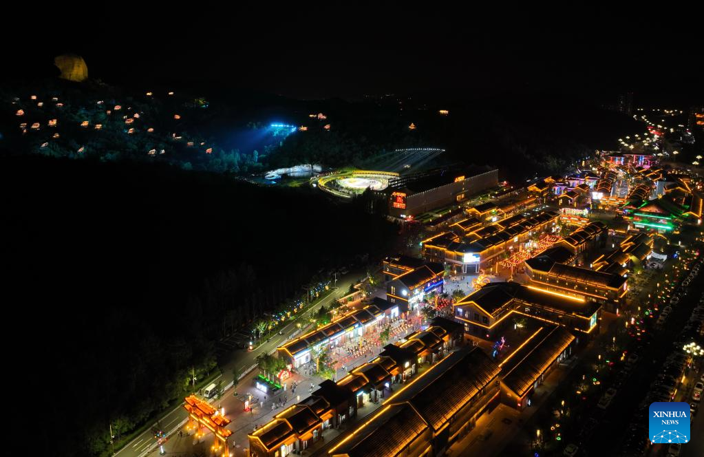 An aerial drone photo taken on July 19, 2024 shows a night view of a cultural industry park in Shuangluan District, Chengde City, north China's Hebei Province. Chengde, a popular summer tourism destination approximately 230 km north of the Chinese capital Beijing, is an important transportation hub in north China. The city with profound cultural heritage is a place where nomadic culture, farming culture, royal culture and folk culture blend together. (Photo by Wang Liqun/Xinhua)