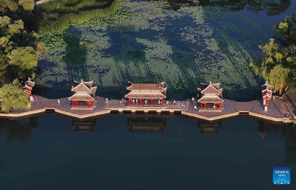 An aerial drone photo taken on July 20, 2024 shows tourists visiting the Imperial Summer Resort in Chengde City, north China's Hebei Province. Chengde, a popular summer tourism destination approximately 230 km north of the Chinese capital Beijing, is an important transportation hub in north China. The city with profound cultural heritage is a place where nomadic culture, farming culture, royal culture and folk culture blend together. (Photo by Liu Mancang/Xinhua)
