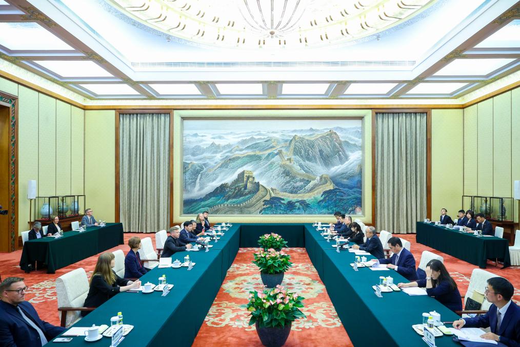 Li Hongzhong, a member of the Political Bureau of the Communist Party of China Central Committee and vice chairman of the National People's Congress Standing Committee, meets with co-chairman of the German Left Party Martin Schirdewan in Beijing, capital of China, July 22, 2024. (Xinhua/Liu Bin)