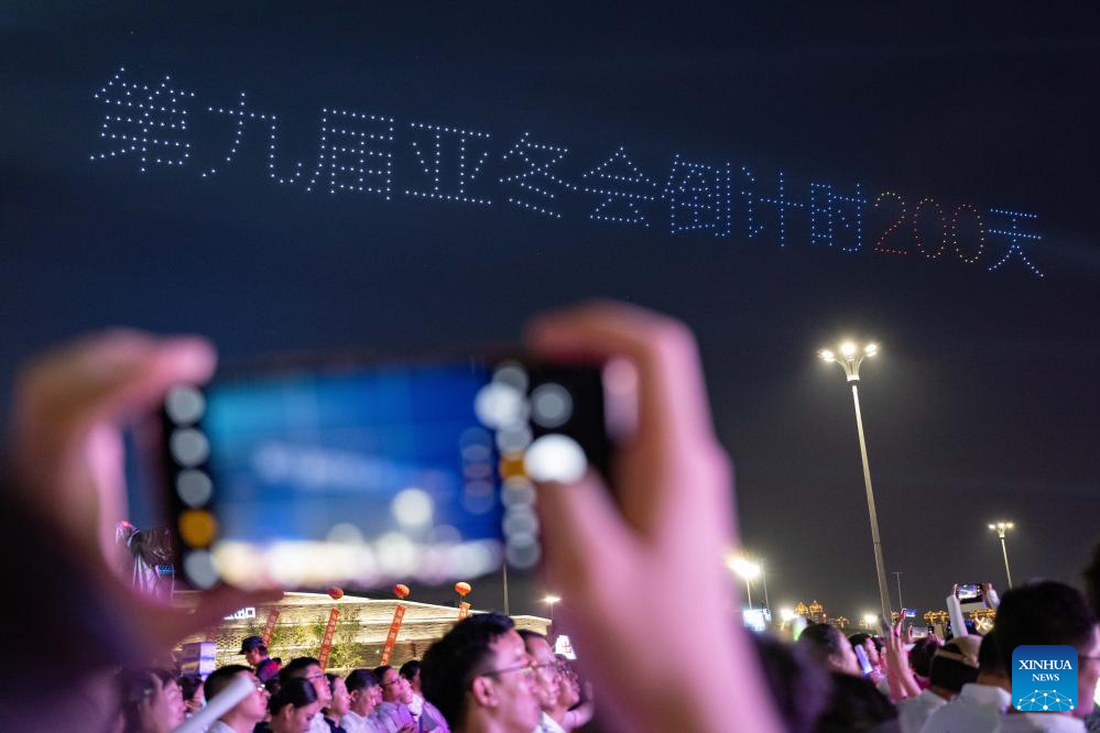 This photo taken on July 22, 2024. shows the drone performance during a ceremony to mark 200 days to go for the 9th Asian Winter Games Harbin 2025 in Harbin, northeast China's Heilongjiang Province. (Xinhua/Xie Jianfei)