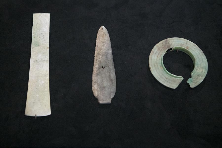 This file photo taken on Dec. 1, 2023 shows a collection of jadeware and stoneware discovered at the Sanxingdui Ruins site in Guanghan City, southwest China's Sichuan Province. (Sichuan cultural relics and archaeology research institute/Handout via Xinhua)