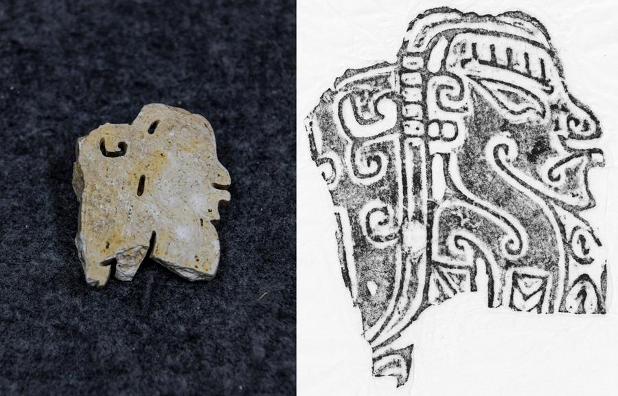 This combo photo shows a side-profile human figure carved on jade discovered at the Sanxingdui Ruins site in Guanghan City, southwest China's Sichuan Province (left, photo taken on July 10, 2024 by Xinhua photographer Wang Xi) and the rubbing of it (provided by Sichuan cultural relics and archaeology research institute). (Xinhua)