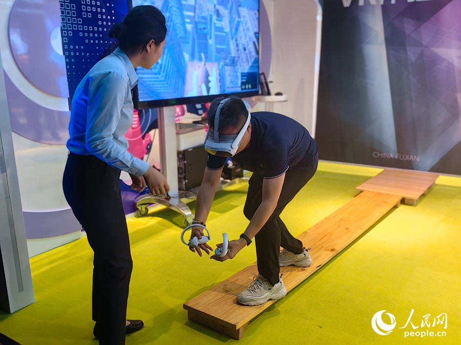 A man uses a virtual reality device to simulate a high-altitude rescue experience. (People's Daily Online/Ye Qingqing)