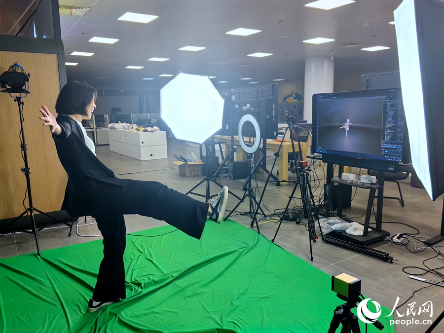A motion capture system collects movements to create an AI-powered digital human. (People's Daily Online/Ye Qingqing)