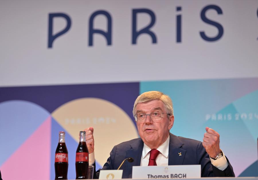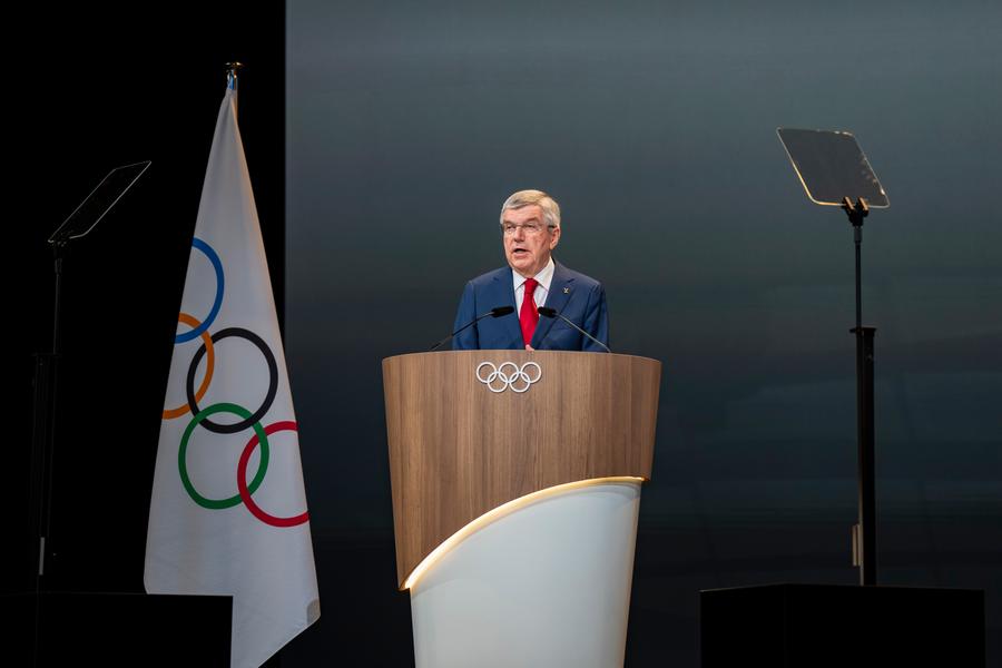 International Olympic Committee (IOC) President Thomas Bach delivers a speech on the first day of the 142nd IOC Session ahead of the Paris 2024 Olympic Games in Paris, France, on July 23, 2024. (Xinhua/Sun Fei)