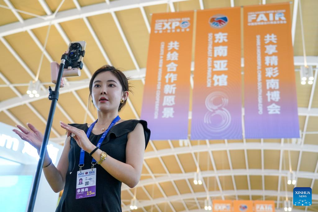 An exhibitor conducts a live streaming at the 8th China-South Asia Expo in Kunming, southwest China's Yunnan Province, July 23, 2024. The 8th China-South Asia Expo opened on Tuesday in Kunming, the capital of southwest China's Yunnan Province, attracting over 2,000 exhibitors. Nearly half of the exhibitors are companies from South and Southeast Asia. (Xinhua/Wang Jingyi)