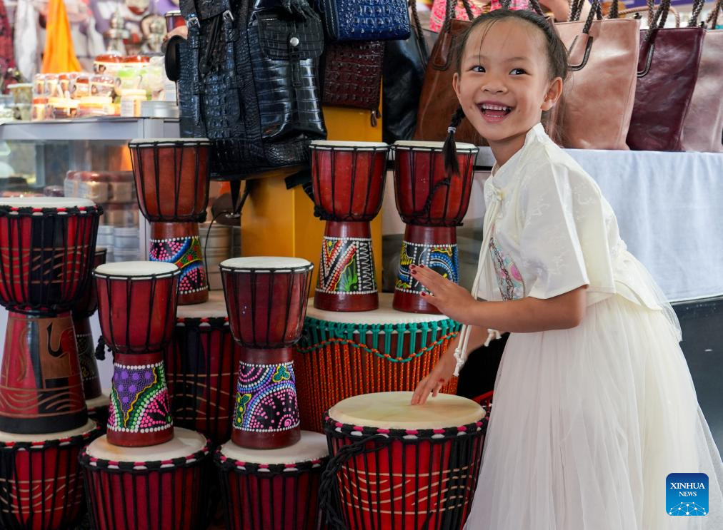 A girl tries to play an African drum at the exhibition area of Ghana at the 8th China-South Asia Expo in Kunming, southwest China's Yunnan Province, July 23, 2024. The 8th China-South Asia Expo opened on Tuesday in Kunming, the capital of southwest China's Yunnan Province, attracting over 2,000 exhibitors. Nearly half of the exhibitors are companies from South and Southeast Asia. (Xinhua/Wang Jingyi)