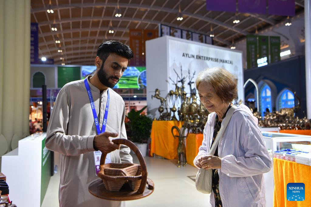 An exhibitor presents a product to a customer at the exhibition area of Pakistan at the 8th China-South Asia Expo in Kunming, southwest China's Yunnan Province, July 23, 2024. The 8th China-South Asia Expo opened on Tuesday in Kunming, the capital of southwest China's Yunnan Province, attracting over 2,000 exhibitors. Nearly half of the exhibitors are companies from South and Southeast Asia. (Xinhua/Liu Lianfen)