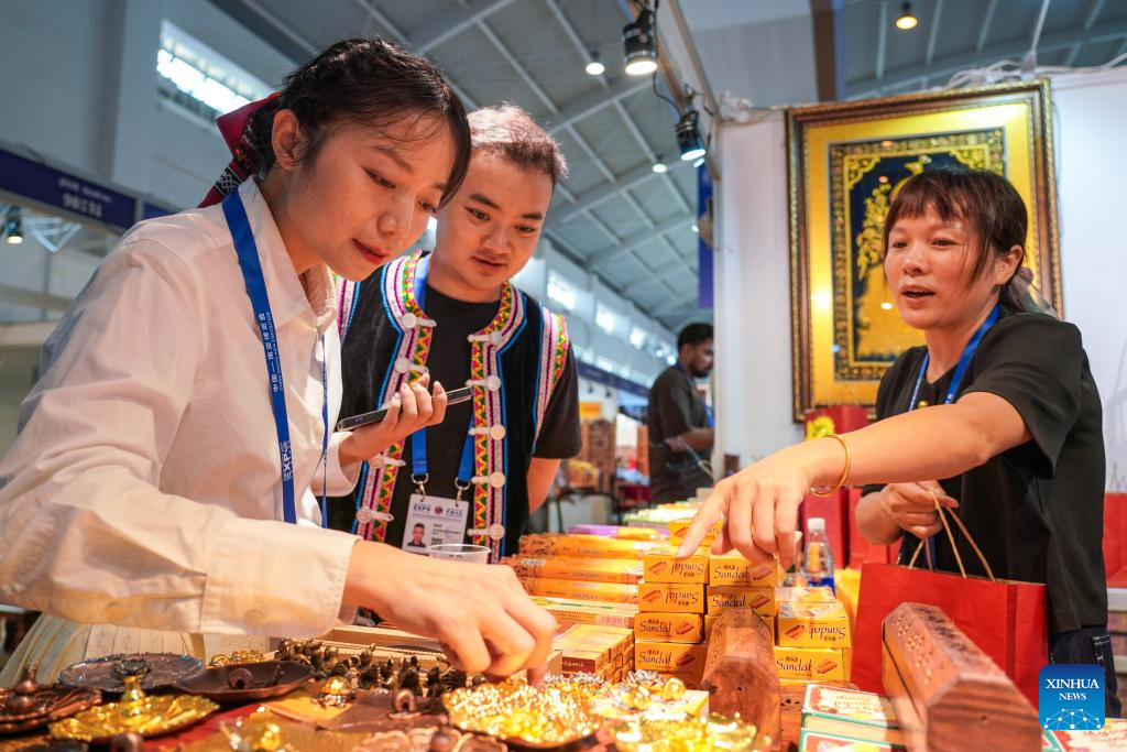 People choose goods at the 8th China-South Asia Expo in Kunming, southwest China's Yunnan Province, July 23, 2024. The 8th China-South Asia Expo opened on Tuesday in Kunming, the capital of southwest China's Yunnan Province, attracting over 2,000 exhibitors. Nearly half of the exhibitors are companies from South and Southeast Asia. (Xinhua/Liu Lianfen)