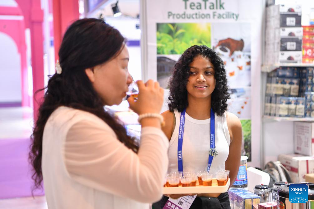 A woman tastes Sri Lankan black tea at the 8th China-South Asia Expo in Kunming, southwest China's Yunnan Province, July 23, 2024. The 8th China-South Asia Expo opened on Tuesday in Kunming, the capital of southwest China's Yunnan Province, attracting over 2,000 exhibitors. Nearly half of the exhibitors are companies from South and Southeast Asia. (Xinhua/Peng Yikai)