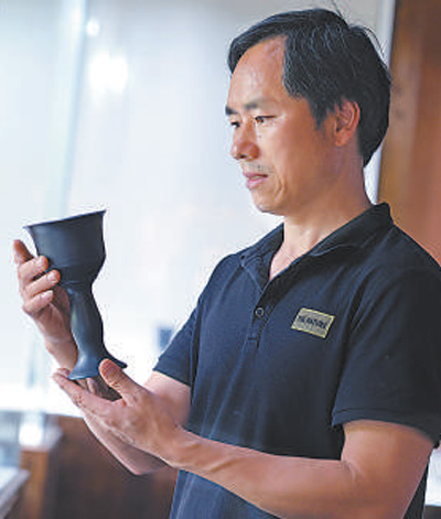 Through continuous exploration, Wu finally remade an eggshell black pottery cup, which is only 0.2 millimeters at the thinnest point, in 2014 by leveraging traditional ways and overcoming technical difficulties.