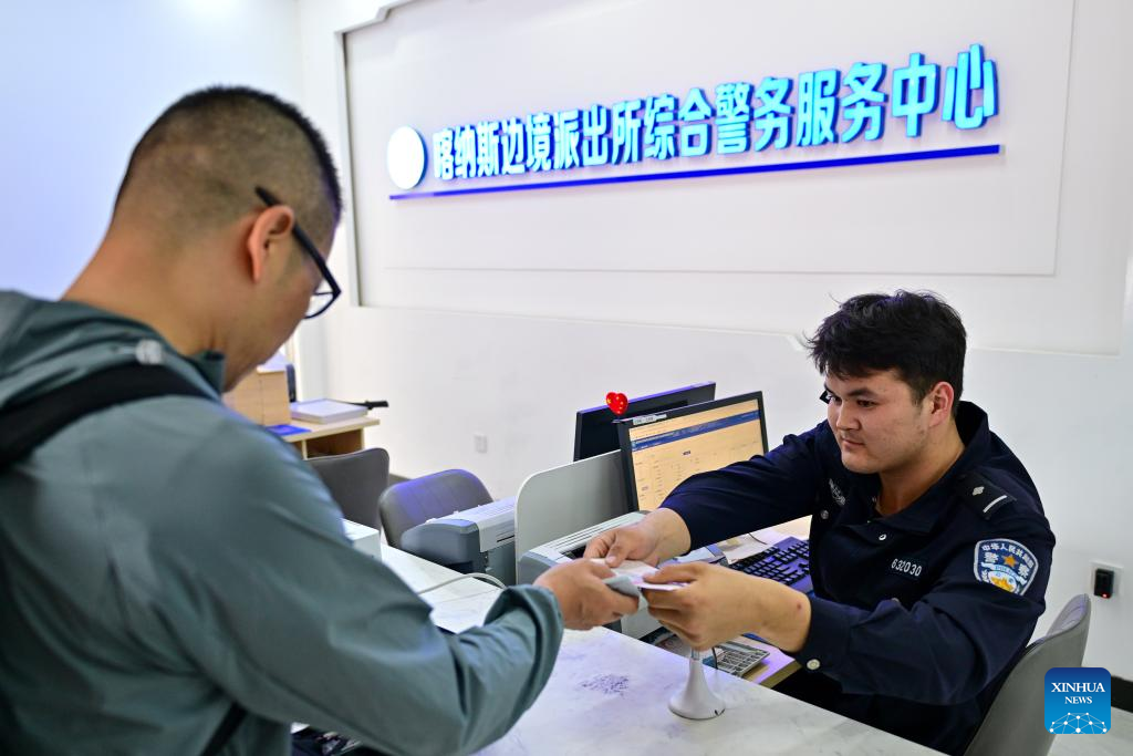 A police officer handles the border pass for a tourist at a service spot of the Kanas border police station in the Kanas scenic area of Altay, northwest China's Xinjiang Uygur Autonomous Region, July 22, 2024. (Xinhua/Ding Lei)
