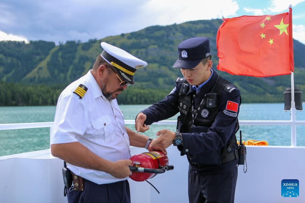 A police officer of the Kanas border police station (R) checks the fire-fighting equipment of a cruise ship in the Kanas scenic area of Altay, northwest China's Xinjiang Uygur Autonomous Region, July 22, 2024. (Xinhua/Lin Liping)