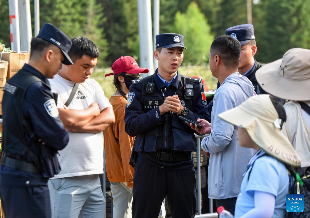 Police officers of the Kanas border police station mediate disputes among tourists in the Kanas scenic area of Altay, northwest China's Xinjiang Uygur Autonomous Region, July 22, 2024. (Xinhua/Huang Xiaoyong)