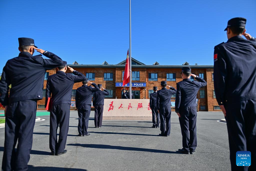 A flag-raising ceremony is held at the Kanas border police station in the Kanas scenic area of Altay, northwest China's Xinjiang Uygur Autonomous Region, July 23, 2024. (Xinhua/Ding Lei)