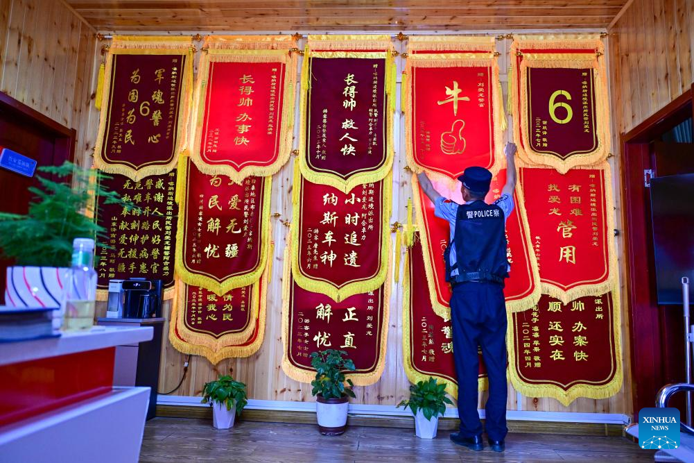 A police officer arranges pennants sent by people to extend gratitude at a service spot of the Kanas border police station in the Kanas scenic area of Altay, northwest China's Xinjiang Uygur Autonomous Region, July 22, 2024. (Xinhua/Ding Lei)