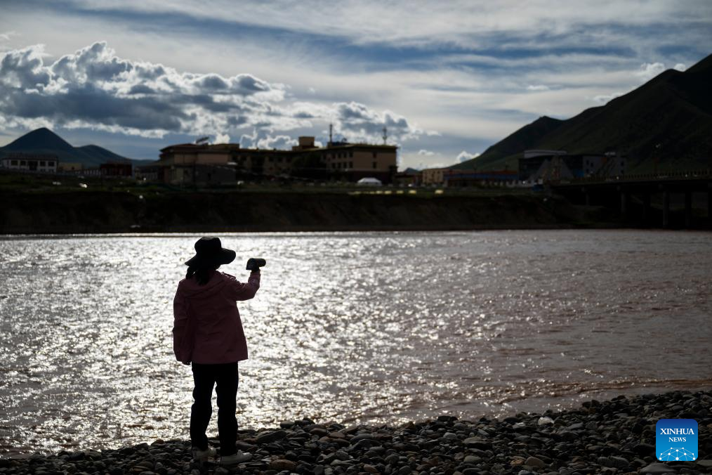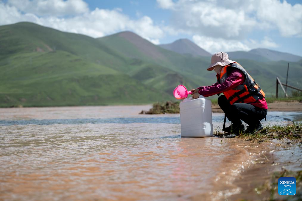 Ma Rui collects water samples during an expedition to investigate the water resources and ecological environment in Sanjiangyuan area, northwest China's Qinghai Province, July 23, 2024. (Xinhua/Wu Zhizun)