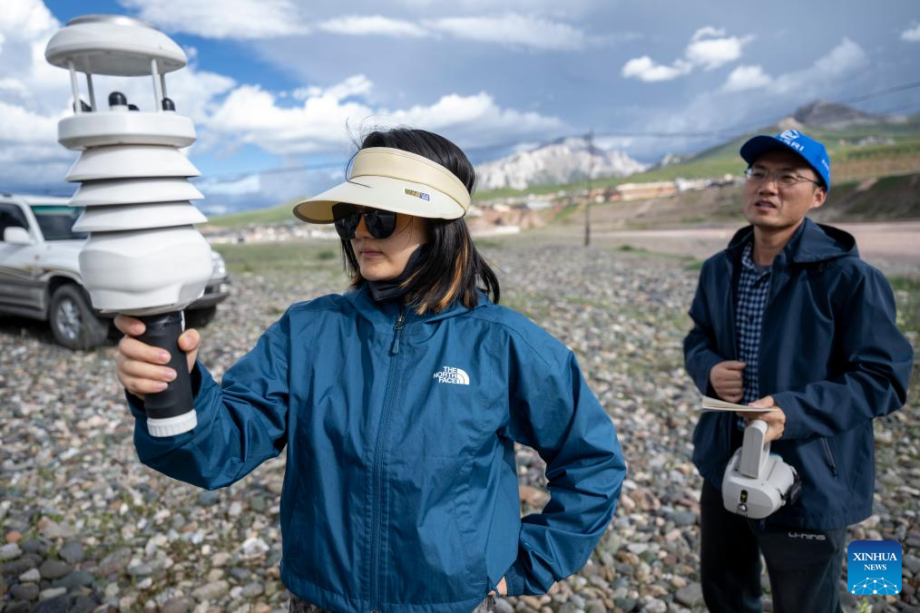 Cheng Shujie (L) makes meteorological measurement during an expedition to investigate the water resources and ecological environment in Sanjiangyuan area, northwest China's Qinghai Province, July 21, 2024. (Xinhua/Wu Zhizun)?