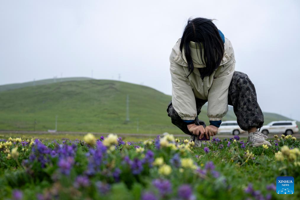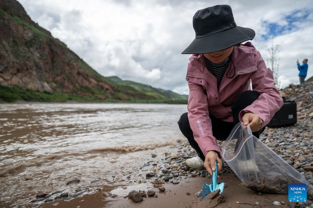 Liu Yujiao collects samples during an expedition to investigate the water resources and ecological environment in Sanjiangyuan area, northwest China's Qinghai Province, July 21, 2024. (Xinhua/Wu Zhizun)