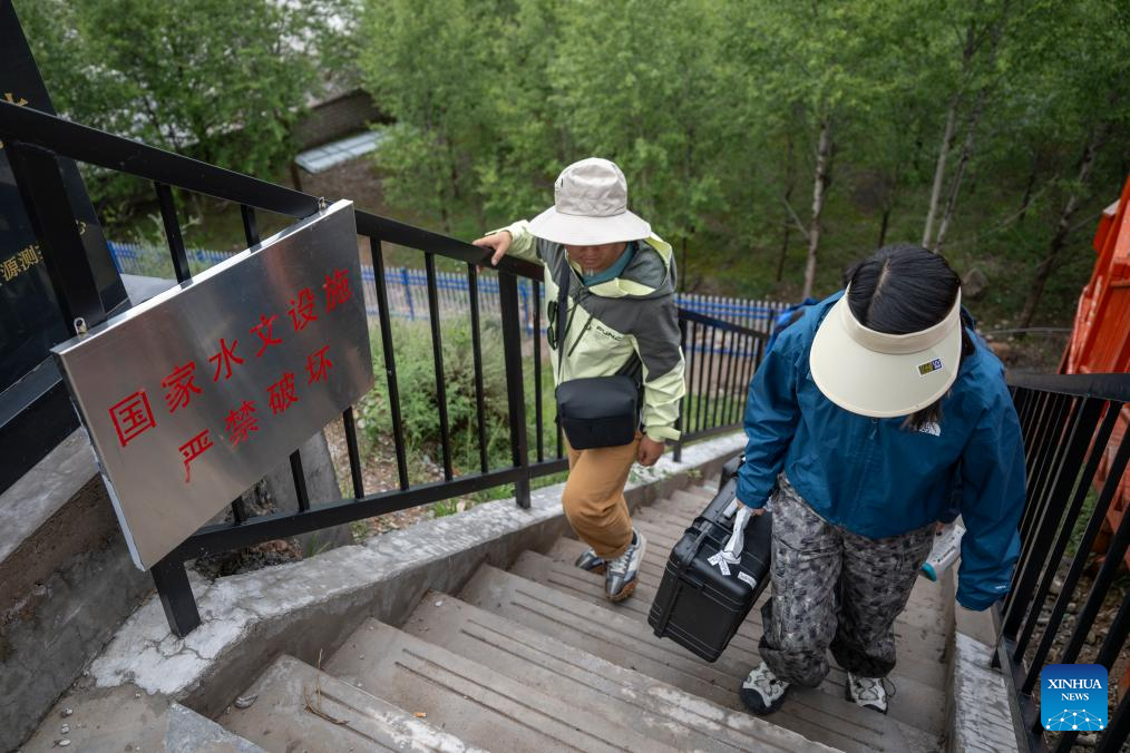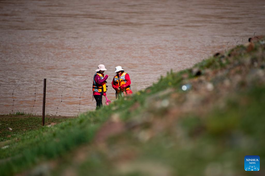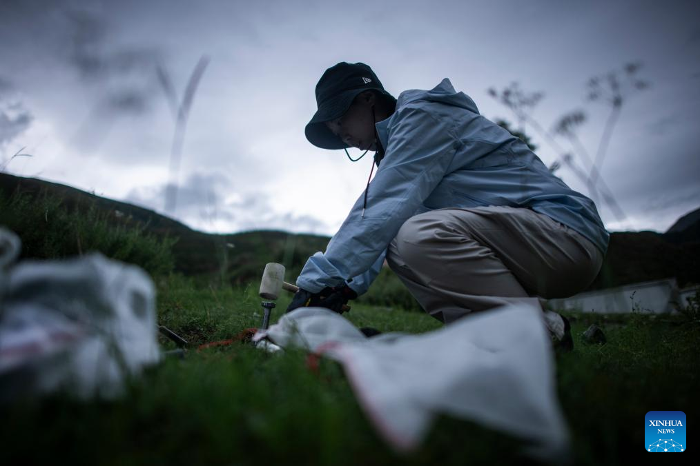 Cheng Shujie (R) works during an expedition to investigate the water resources and ecological environment in Sanjiangyuan area, northwest China's Qinghai Province, July 21, 2024. (Xinhua/Wu Zhizun)