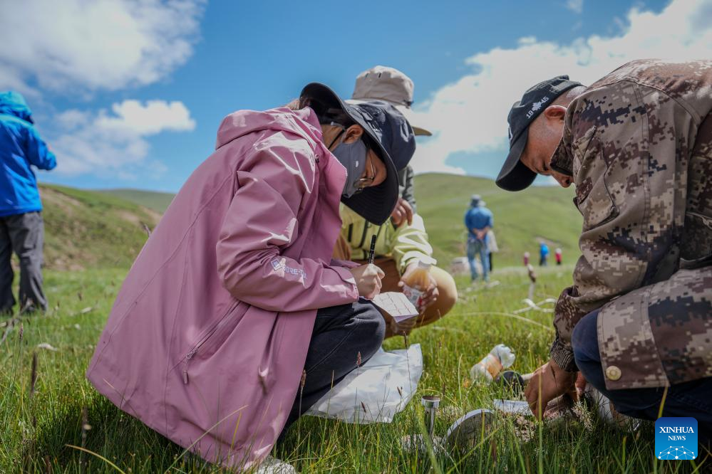 Fu Junlin checks the soil during an expedition to investigate the water resources and ecological environment in Sanjiangyuan area, northwest China's Qinghai Province, July 20, 2024. (Xinhua/Wu Zhizun)