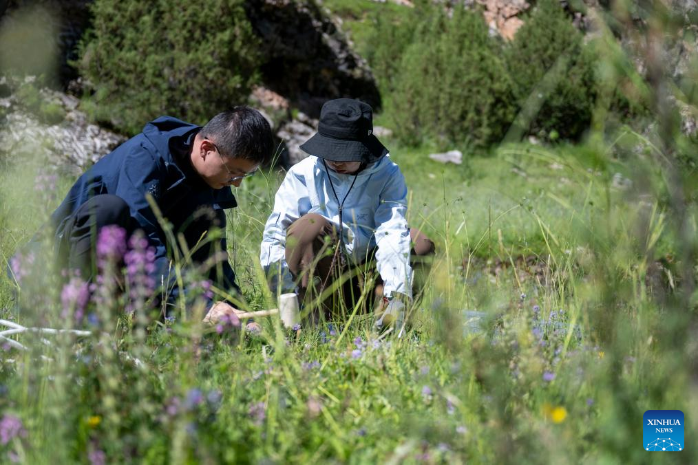 Fu Junlin (R) and her colleague check the soil during an expedition to investigate the water resources and ecological environment in Sanjiangyuan area, northwest China's Qinghai Province, July 21, 2024. (Xinhua/Chen Jie)