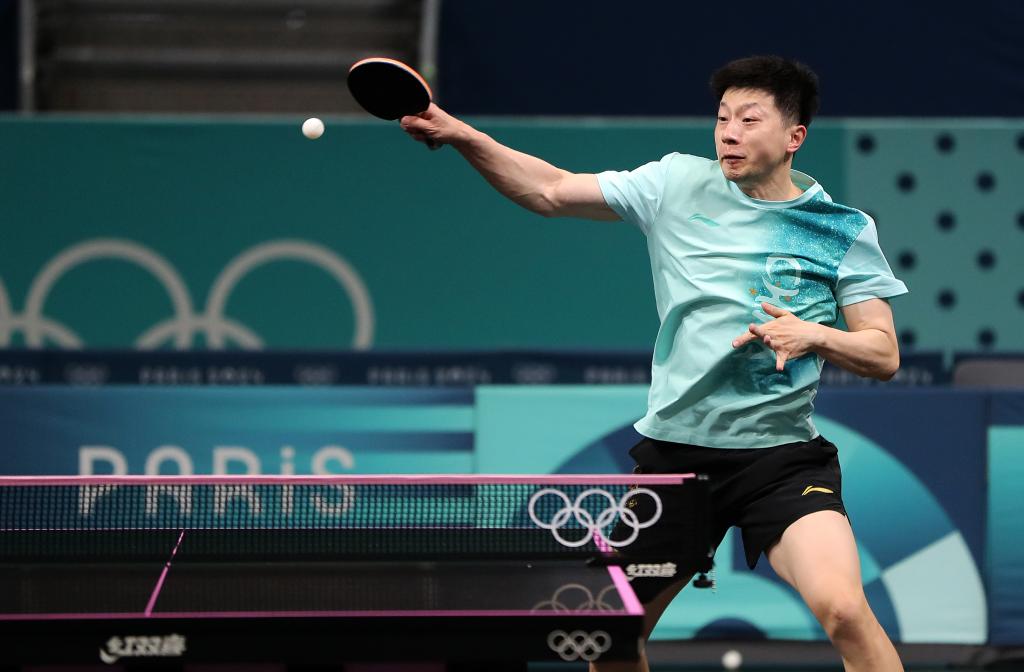 Ma Long hits a return during a training session for Paris 2024 in South Paris Arena, Paris, France, July 22, 2024. (Xinhua/Wang Dongzhen)