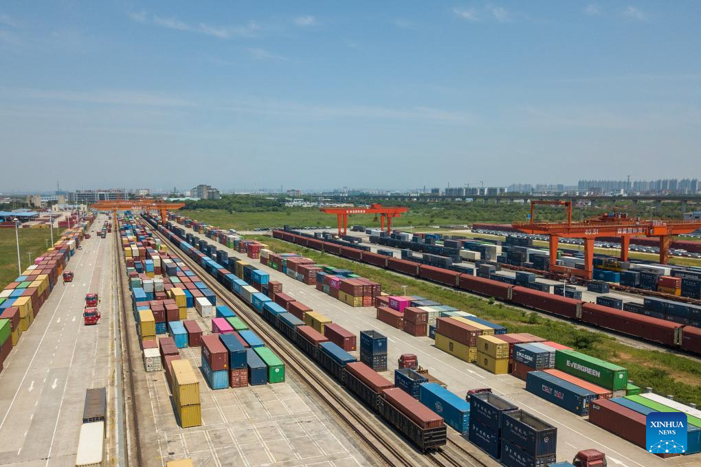 An aerial drone photo shows the Nanchang International Land Port in Nanchang, east China's Jiangxi Province, July 22, 2024. (Xinhua/Li Xin)