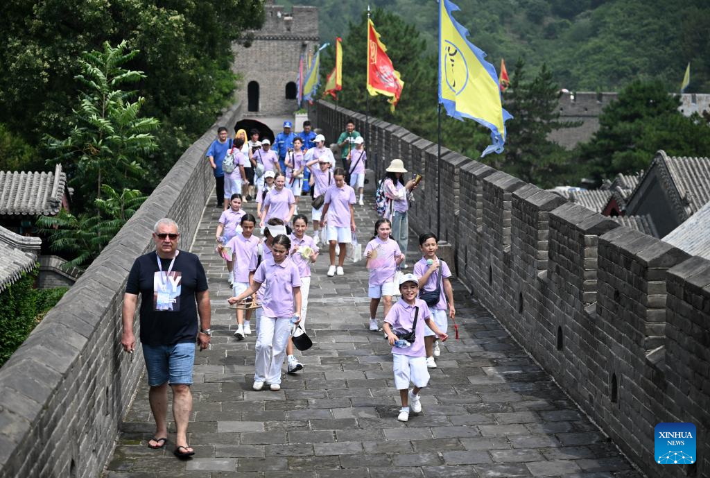 Children from Uzbekistan visit Huangyaguan section of the Great Wall in north China's Tianjin, July 24, 2024. (Xinhua/Zhao Zishuo)