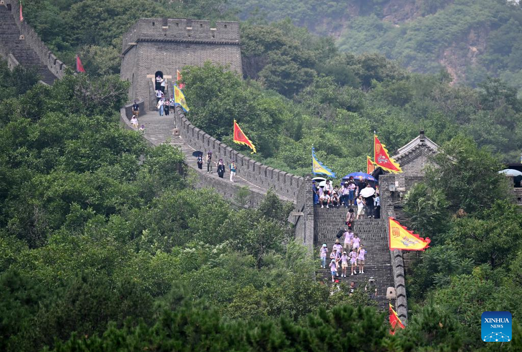 Youngsters visit Huangyaguan section of the Great Wall in north China's Tianjin, July 24, 2024. (Xinhua/Zhao Zishuo)