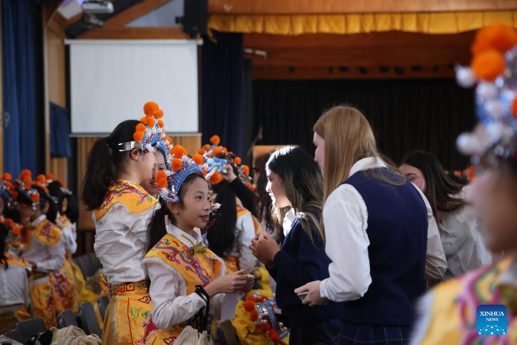 Members of China's Guangzhou Opera House Children's Choir watch a performance of students of Wellington East Girls' College in Wellington, New Zealand, July 24, 2024. Members of Guangzhou Opera House Children's Choir visited Wellington East Girls' College in New Zealand on Wednesday, and held a joint concert with the high school's choir at the opening ceremony of the new semester of the school. (Photo by Meng Tao/Xinhua)