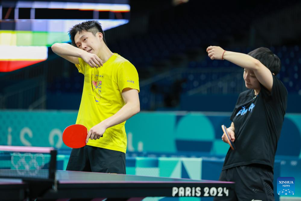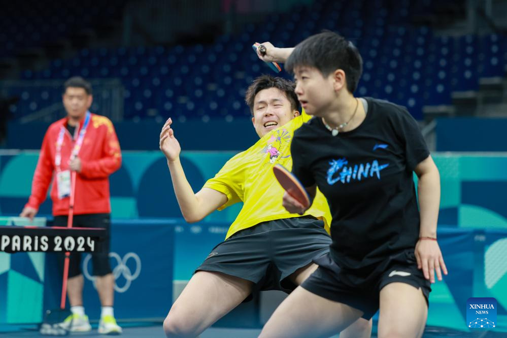 Wang Chuqin (L)/Sun Yingsha of China take part in a table tennis training session ahead of the Paris 2024 Olympic Games in Paris, France, on July 24, 2024. (Xinhua/Liu Xu)