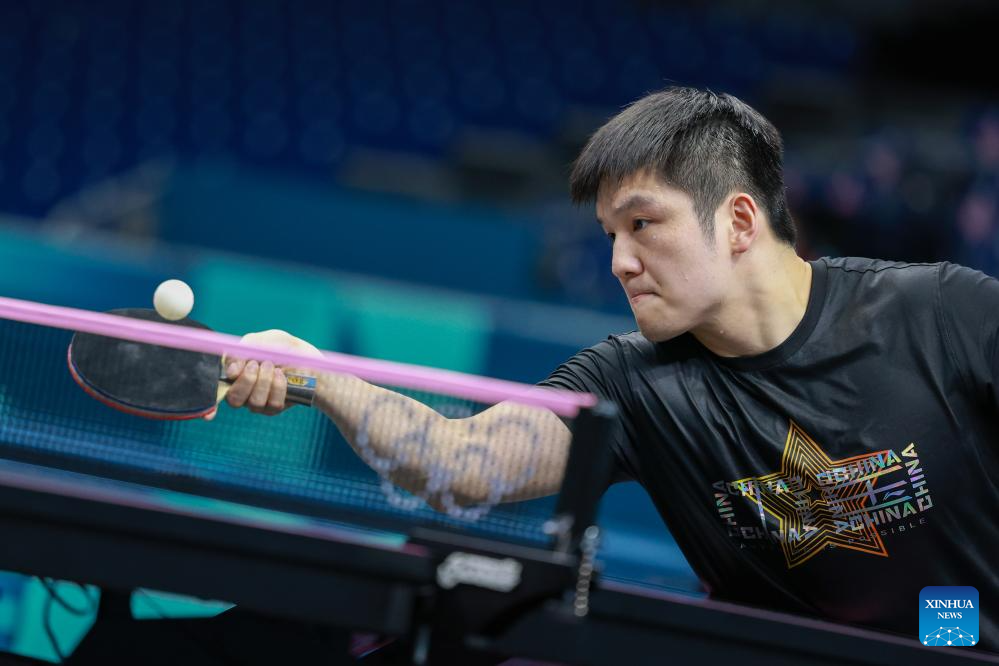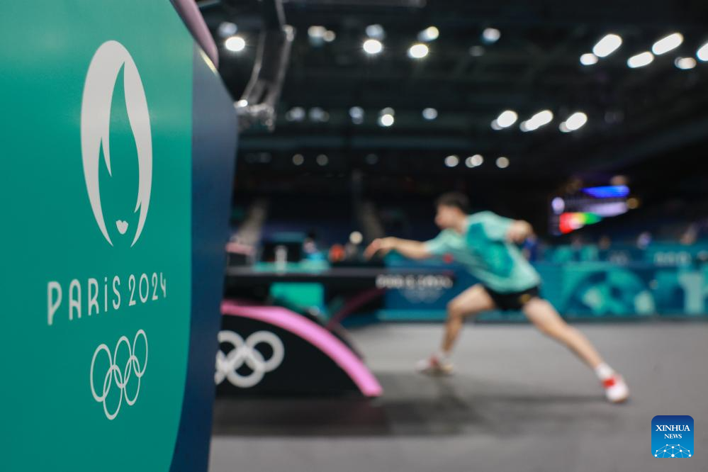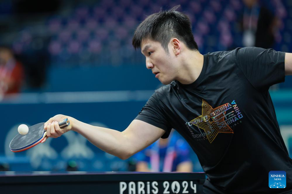 Fan Zhendong of China takes part in a table tennis training session ahead of the Paris 2024 Olympic Games in Paris, France, on July 24, 2024. (Xinhua/Liu Xu)