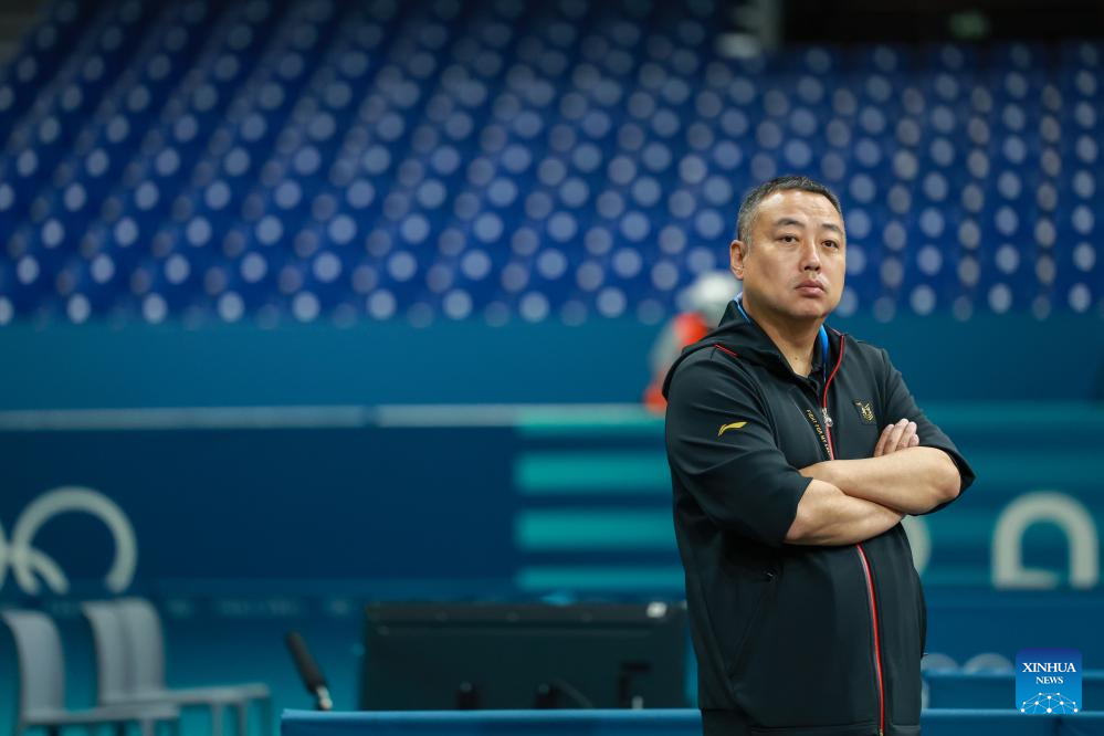 Liu Guoliang, president of the Chinese Table Tennis Association, reacts during a table tennis training session ahead of the Paris 2024 Olympic Games in Paris, France, on July 24, 2024. (Xinhua/Liu Xu)