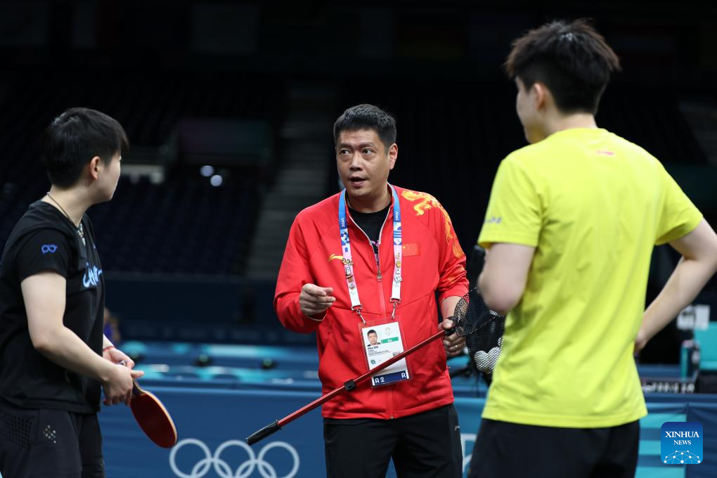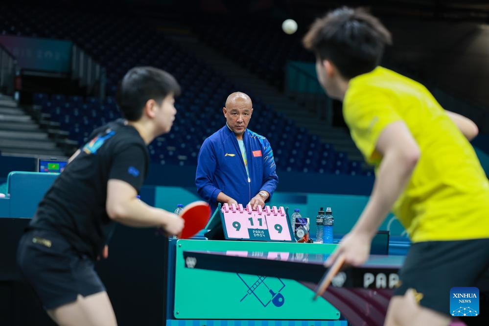 Xiao Zhan (C), coach of the Chinese national table tennis team looks on Wang Chuqin / Sun Yingsha of China during a table tennis training session ahead of the Paris 2024 Olympic Games in Paris, France, on July 24, 2024. (Xinhua/Liu Xu)