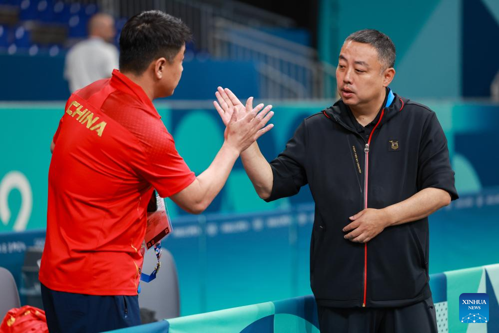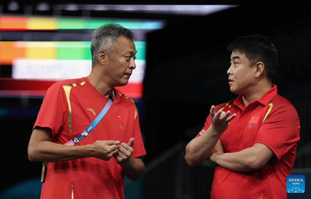 Liu Guoliang (R), president of the Chinese Table Tennis Association, interacts with Wang Hao, coach of the Chinese national table tennis team during a table tennis training session ahead of the Paris 2024 Olympic Games in Paris, France, on July 24, 2024. (Xinhua/Liu Xu)