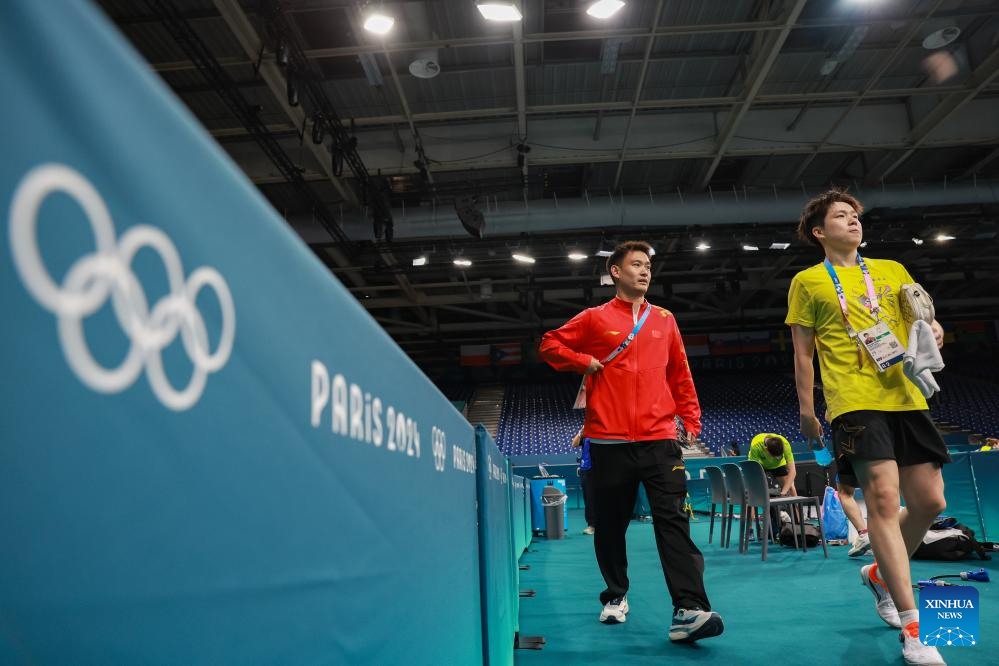 Wang Chuqin (R) of China leaves after a table tennis training session ahead of the Paris 2024 Olympic Games in Paris, France, on July 24, 2024. (Xinhua/Liu Xu)