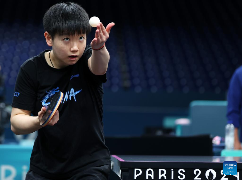 Sun Yingsha of China takes part in a table tennis training session ahead of the Paris 2024 Olympic Games in Paris, France, on July 24, 2024. (Xinhua/Wang Dongzhen)