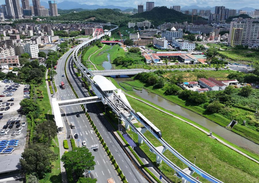 An aerial drone photo shows an autonomous bus running on elevated rails in Pingshan District of Shenzhen, south China's Guangdong Province, July 22, 2024. (Xinhua/Li He)