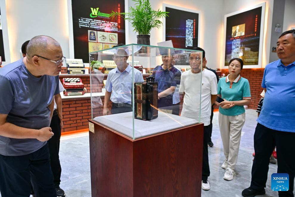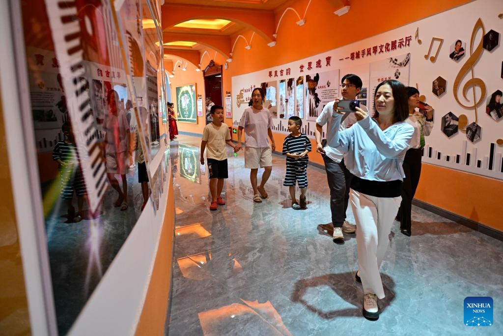 Tourists visit an accordion exhibition hall in Tacheng City, northwest China's Xinjiang Uygur Autonomous Region, July 24, 2024. (Xinhua/Lin Liping)