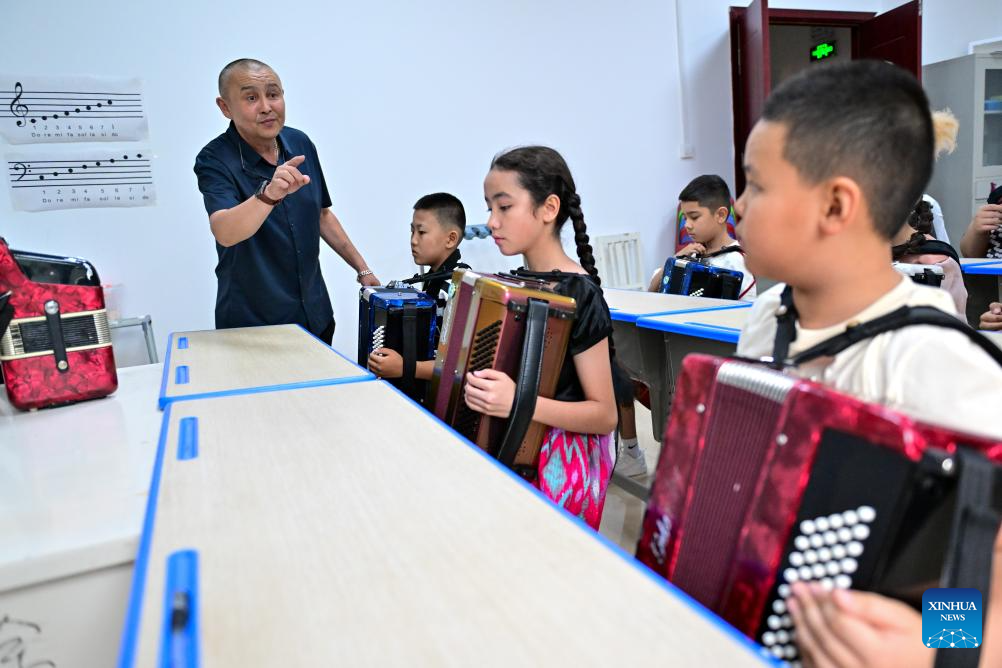 A teacher (1st L) makes a point as students learn to play accordion in Tacheng City, northwest China's Xinjiang Uygur Autonomous Region, July 24, 2024. (Xinhua/Ding Lei)