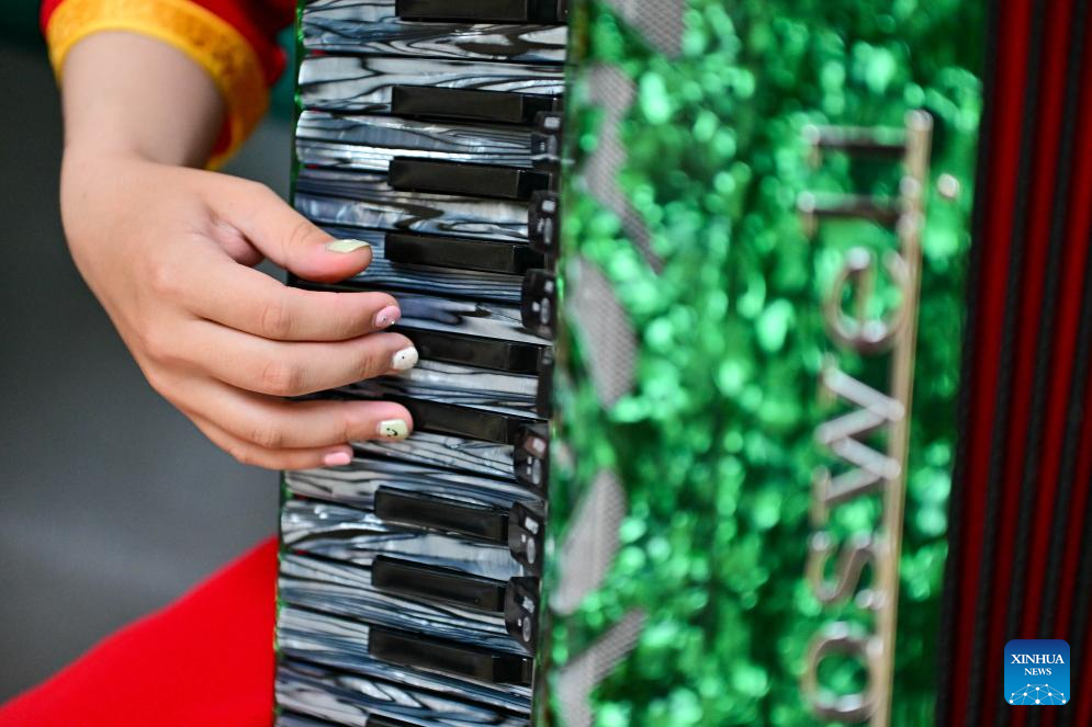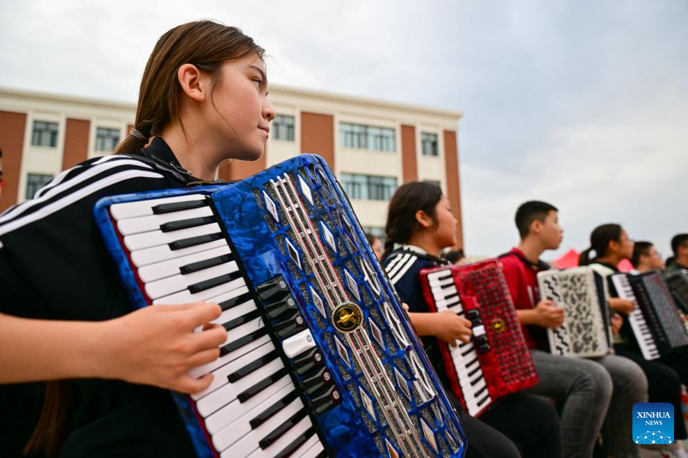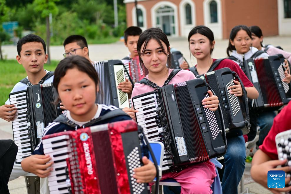 Students play accordions at a middle school in preparation for an upcoming accordion art festival in Tacheng City, northwest China's Xinjiang Uygur Autonomous Region, July 24, 2024. (Xinhua/Huang Xiaoyong)
