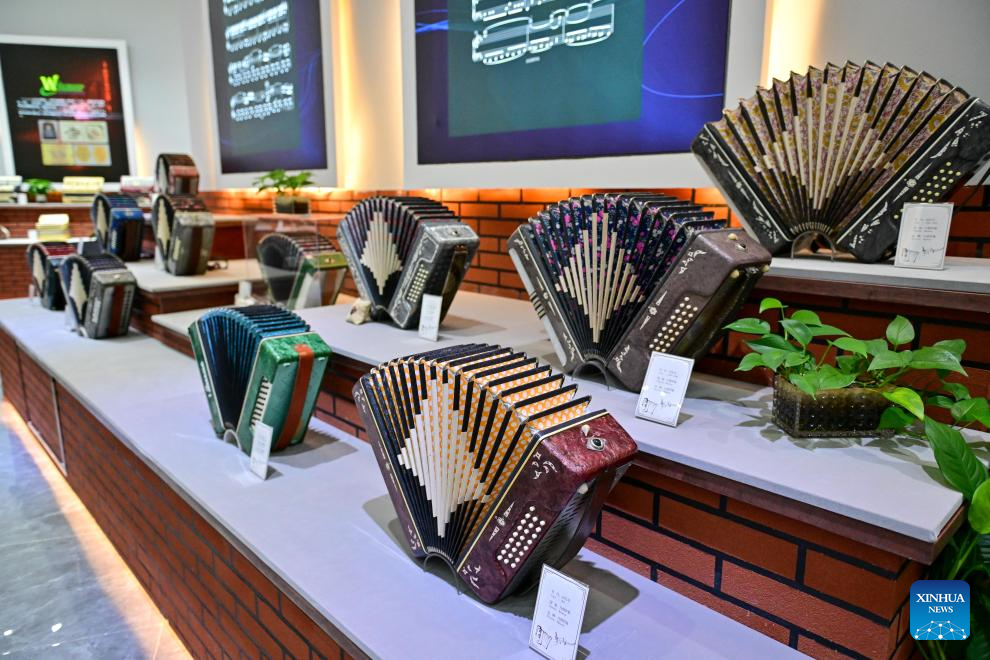 This photo taken on July 24, 2024 shows accordions displayed at an accordion exhibition hall in Tacheng City, northwest China's Xinjiang Uygur Autonomous Region. (Xinhua/Ding Lei)