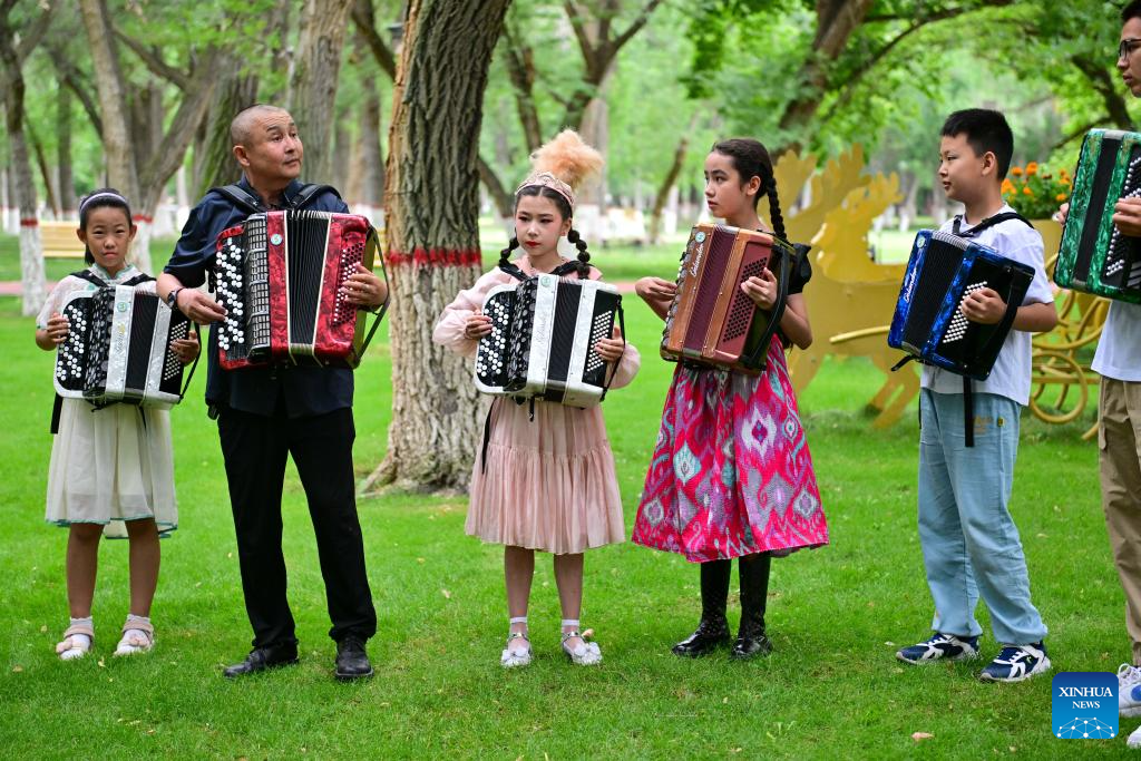 Students practice as an accordion teacher leads at a square in Tacheng City, northwest China's Xinjiang Uygur Autonomous Region, July 24, 2024. (Xinhua/Ding Lei)