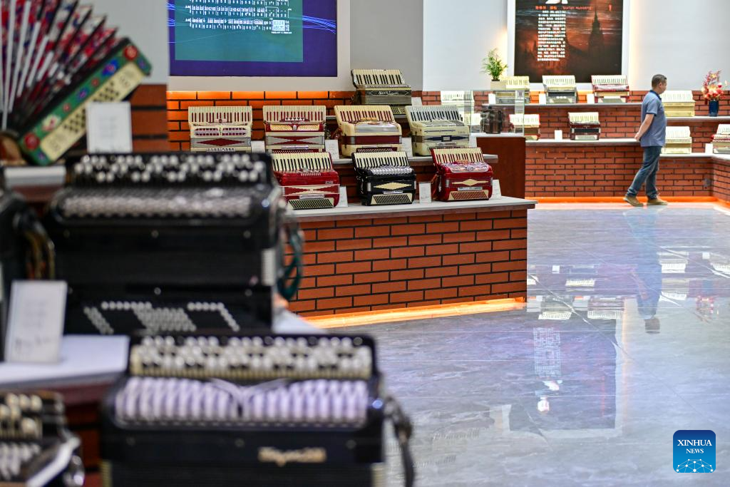 A tourist visits an accordion exhibition hall in Tacheng City, northwest China's Xinjiang Uygur Autonomous Region, July 24, 2024. (Xinhua/Ding Lei)
